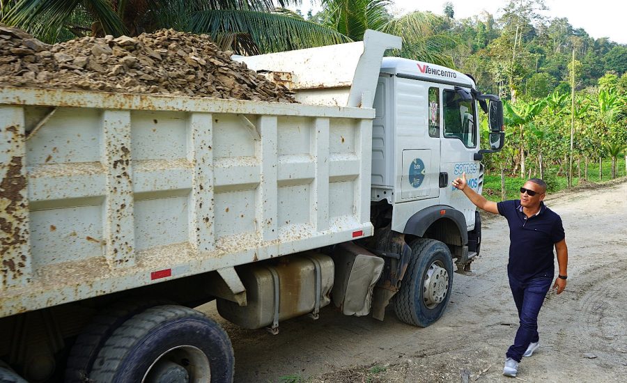 El alcalde Joffre Quintero Bolaños, junto a su equipo de Obras Públicas, Concejales, técnicos del Municipio y del GAD parroquial, trabaja en la reconformación y cascoteo de la vía de ingreso al recinto
